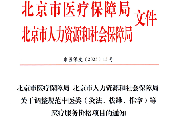 根据《北京市医疗保障局、北京市人力资源和社会保障局关于调整规范中医类(灸法、拔罐、推拿)等医疗服务价格···