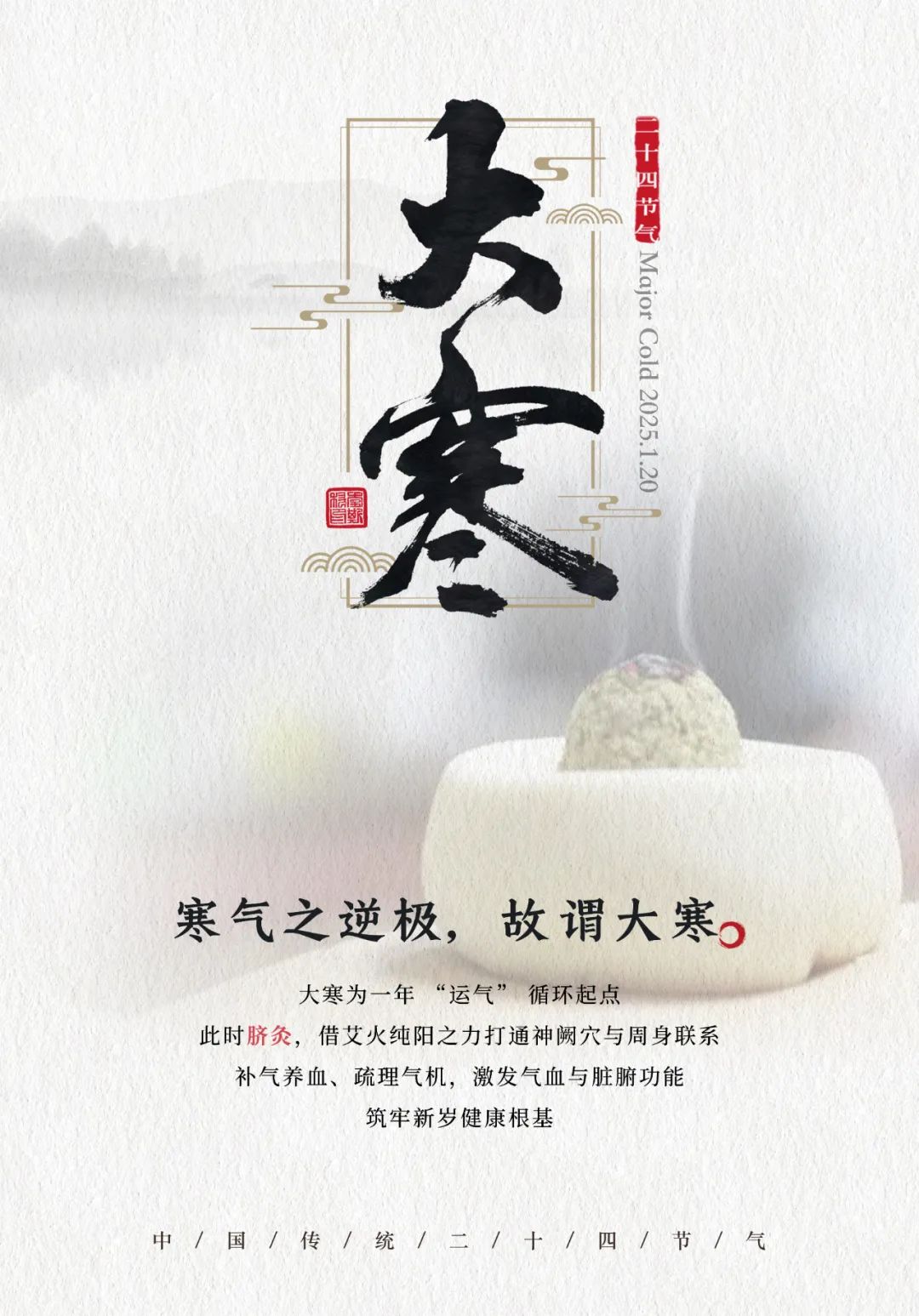 大寒时节,天气寒冷,人体阳气内藏,气血运行相对缓慢。此时,人体的新陈代谢减缓,抵抗力也相对较弱,容易受到寒邪的侵袭。而寒邪为阴邪,易伤阳气,导致阳气不足,出现手脚冰凉、畏寒怕冷、关节疼痛等症状。同时,大寒处于冬末,与春季的交接时期,是一年“运”、“气”循环变化的开始,此时脐灸,补气养血,又可以疏理气机,有着不可忽视的重要作用。